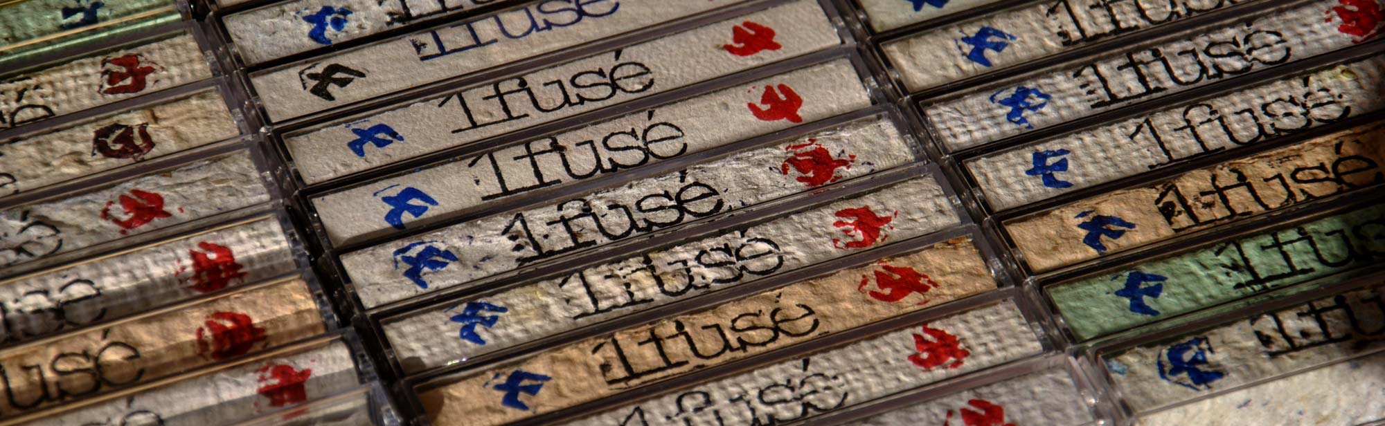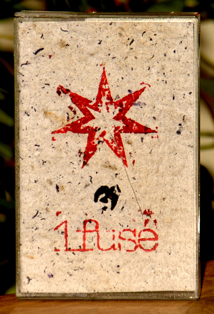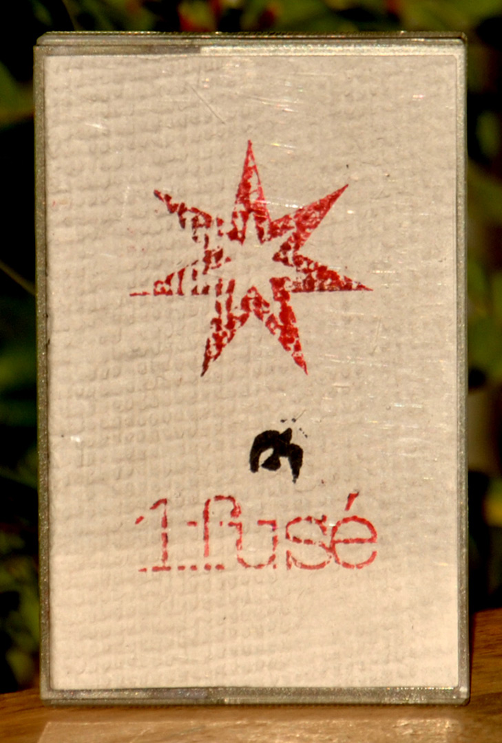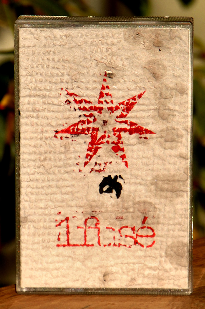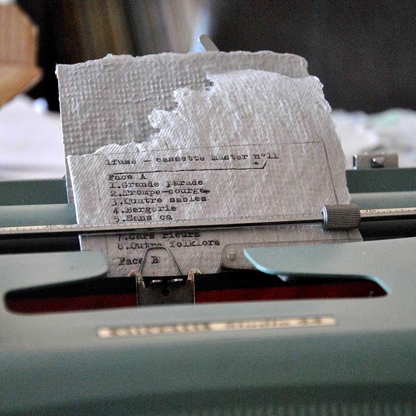Pour les pochettes : papier fait maison avec incorporation de diverses graines et pigments, machine à écrire Olympus Studio 44, tampons, papier autocollant blanc (pour les etiquettes sur les cassettes).