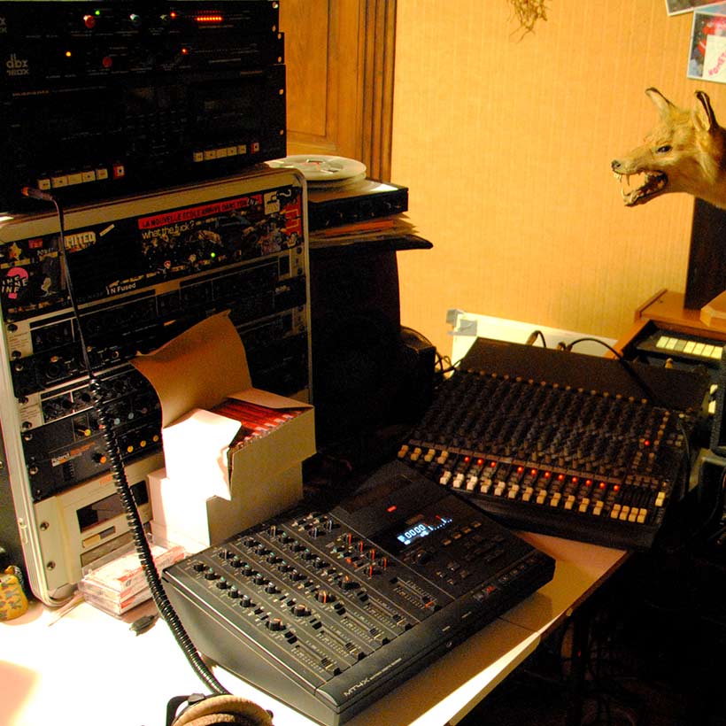 Enregistreur 4 pistes à cassette yamaha MT4X, table de mixage Mackie 1604 VLZ Pro, Roland RE 501 chorus echo, tape delay Korg stage echo, 2 compresseurs DBX 160X, platine double cassette Marantz PMD510 pro.